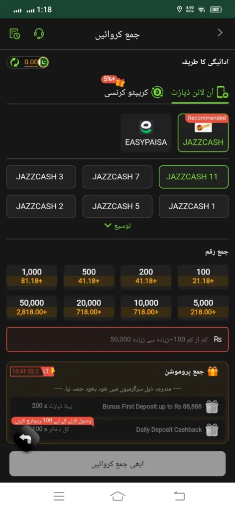 The platform supports Easypaisa and JazzCash. Therefore, deposits and withdrawals are quick and convenient.
