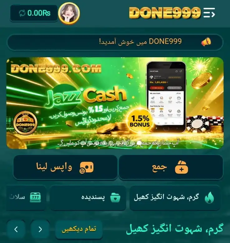 Done999 Game is a modern online earning platform that combines gaming and income opportunities. It offers various games like slots, lottery, sports betting, fishing, and card games. Moreover, its easy withdrawal methods as Easypaisa and JazzCash make it suitable for users in Pakistan .